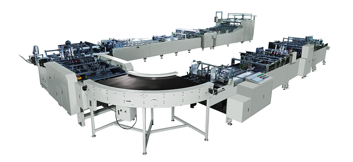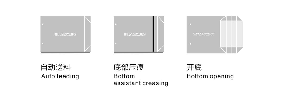 該方案是以單張紙、頭卡和底卡為原料,由飛達(dá)進(jìn)行全自動(dòng)送紙,經(jīng)由輸紙平臺(tái)進(jìn)行輸送,然后用前規(guī)、側(cè)規(guī)進(jìn)行單張準(zhǔn)確定位,送入壓線部壓豎線。自動(dòng)涂膠(可同時(shí)噴熱熔膠),成型,自動(dòng)折風(fēng)琴,自動(dòng)壓筒,再經(jīng)由推規(guī)定位,送入壓橫線裝置壓橫線,再進(jìn)入拉底,上底膠,底部成型,一次完成。本機(jī)采用觸摸屏控制,制袋精度髙,速度快,全過(guò)程自動(dòng)化,生產(chǎn)效率與傳統(tǒng)手工制作相比提供幾十倍,是加工出口型手提袋,髙檔奢侈品手提袋的理想全自動(dòng)設(shè)備。